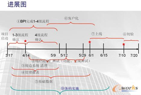 基于管理提升, “建立鋼材為主線的供應鏈快速響應能力和實現管理精細化”為目標的ERP升級項目,在中集青島冷藏產業基地經過3個半月的緊張推廣實施,于08年7月10日順利實現財務月結和財務報表生成,完成了項目上線。項目進展圖如下: