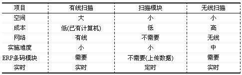 生產現場的設計,主要有三種方式:有線掃描,需要硬件計算機、有線掃描器、現場的局域網;掃描模塊,需要硬件:掃描模塊(定時從模塊下載數據,上傳數據至ERP系統);無線掃描,需要硬件:RF掃描器,無線局域網?梢砸罁髽I的實際情況,使用不同的方式。主要考慮空間,已有的設備,成本等因素。也可以采用混合的模式。圖2提供的是生產現場采用掃描模塊的方式。三種方式的比較見表1: