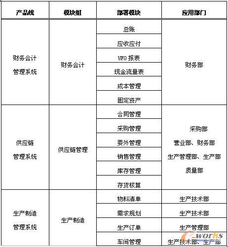 根據ERP整體業務流程圖,進行產品部署如下表所示: