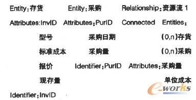 此步驟中一個突出的實務界問題是:如何區分某個屬性是實體的屬性還是關系的屬性。比如,“采購量”屬性應該配置給“存貨”實體,“采購”實體。還是“資源流1”關系?區分的辦法是判斷該屬性所描述的是單一的R、E、A,還是多個R、E、A的聯合體。實踐告訴我們,要唯一確定采購量。必須同時確定是什么存貨和哪次采購(即InvID和PurID),二者缺一不可,因此采購量屬性既不是只描述存貨實體的,也不是只描述采購實體的,是描述存貨和采購之間的資源流1關系(聯合體)的屬性。
