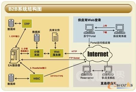 ERP不是孤立的系統(tǒng),在成為企業(yè)內(nèi)各種業(yè)務(wù)信息和流程的總控平臺后,與外界的接口也成為重要的應(yīng)用方向。ERP與B2B在蘇寧各有分工; ERP梳理企業(yè)內(nèi)部的管理流程,而B2B則面向上游的供應(yīng)商; ERP負責將終端數(shù)據(jù)進行收集、整理、加工、系統(tǒng)內(nèi)的傳遞,而B2B平臺則承擔與外部供應(yīng)商的數(shù)據(jù)交換,商品采購、配送等商業(yè)環(huán)節(jié)。蘇寧電器把ERP作為B2B平臺的后援,進行了功能界定后,逐漸向成熟的供應(yīng)鏈應(yīng)用發(fā)展,其與供應(yīng)商之間的協(xié)同效應(yīng)將會逐漸顯現(xiàn)。