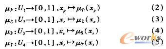 P,C,S和T均為模糊概念,因此使用模糊數學的方法處理。設論域U1、U2、U3和U4分別表示P,C,S和T的取值范圍,分別建立P,C,S和T的取值到閉區間[0,1]的一個影射,即有:
