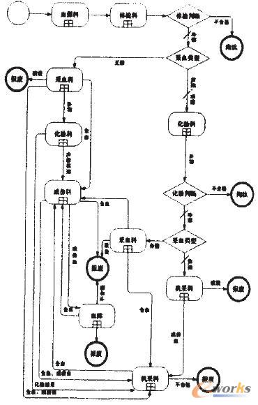 在業務流程建模階段,首先要對業務流程作深入的分析,確定組織機構之間及其內部的業務流程處理工序,確定控制流的走向。同時要對各流程進行細化,包含相關實體的定義及其上下文的信息,由于各個流程之間可以互相通信,我們對業務流程進行分層次建模。其次,活動之間通過信息轉移進行聯系,由上層活動提供輸入資源,活動根據相應的要求進行處理,完成其功能。處理完畢后,將所請求的信息提供給相應的活動。以圖2中的血庫為例:“成份科”從其上層活動“采血科”和“化驗科”得到信息并對其處理,將結果告知血庫將其檢驗結果通知血庫,血庫根據要求進行相應的處理。從一個活動向另一個活動的轉移可以是有條件的,也可以是無條件,如:采血科向血庫提交成份血就是無條件的,而進入化驗科的信息需要是體檢合格人員的信息。
