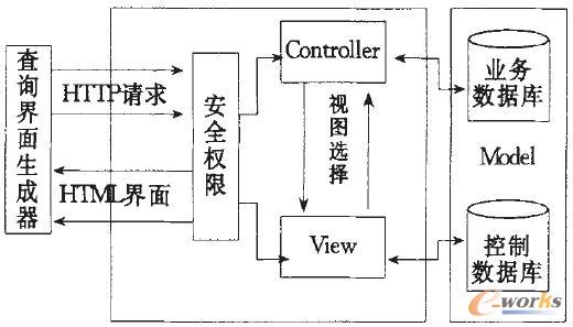 該模型將實現兩個功能(圖1所示)。其一,Controller首先通過用戶界面生成請求條件。然后調用Model中的相應業務邏輯程序化請求條件,最后View將處理結果生產HTTP界面返回用戶。其二,是將用戶提交的請求轉化為系統識別的語句,判斷用戶請求是否符合安全權限,并通過ModeI返回。這樣就實現了用戶請求過程和數據庫分離,因此對于企業級應用是一種有效的解決方案。