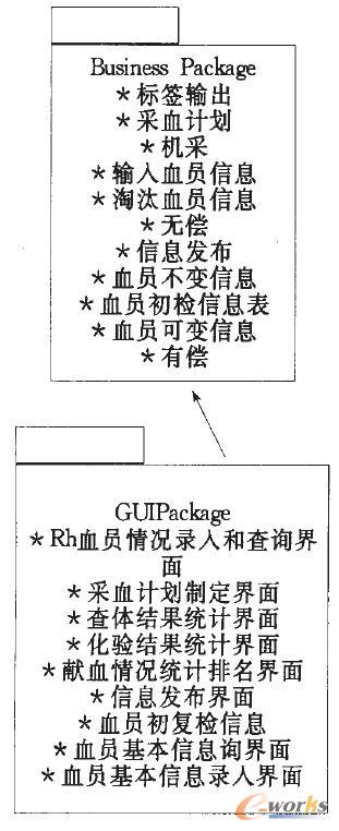 子系統設計模型以圖4血源科子系統為例,血源科子系統也分為兩個包(Package):界面包(GUI Package)和事務包(Business Package)。界面包包含的事務對象有血員不變信息、血員可變信息、標簽輸出、輸入血員信息、淘汰血員信息,界面包含血員基本信息錄入界面、血員基本信息查詢界面、查體結果統計界面、化驗結果統計界面、Rh血員情況錄入和查詢界面、采血計劃制定界面、獻血情況統計排名界面、信息發布界面等。