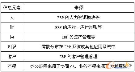 我們從信息元素矩陣的角度出發,如表2所示,可以看出信息元素(人、財、物、知識、客戶、流程)也可以來自以ERP為主的系統中。