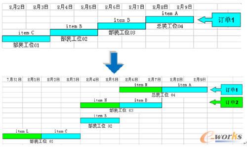 “有限能力”體現在工位上設備和人員的數量,換個角度來說,即此工位同時可裝配任務的數量。下圖所示工位01的能力不能同時滿足訂單1與訂單2在8月2日到3日兩天的時間段內的生產負荷,所以,在編制生產計劃時,自動將訂單2在部裝工位01的生產計劃向前推移2天,移至該工位的空閑時間段。