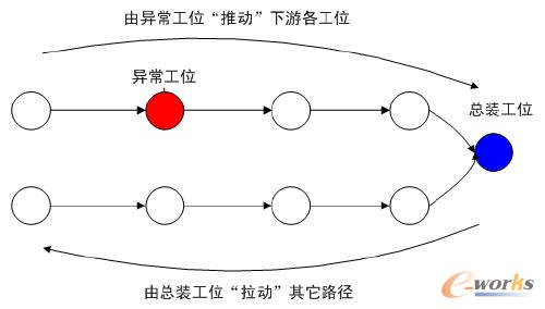 在實際生產過程中,如果某個工位出現了“異常”情況,如:物料供應不及時、機器故障、人為拖期等,導致該工位生產計劃進行了調整,那么,整個單件產品在下游各個工位的生產計劃也會相應的進行推動式調整。如圖4所示。