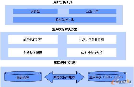從企業(yè)預算實際考慮,標準的預算管理系統(tǒng)的整體架構由三部分組成:最底層的是數據層,由數據倉庫與應用系統(tǒng)組成,通過數據交換與集成,為業(yè)務執(zhí)行解決方案與用戶分析工具提供基礎數據,業(yè)務執(zhí)行解決方案包括戰(zhàn)略執(zhí)行監(jiān)控、計劃、預算和預測、財務整合報表、成本與收益分析這幾個方面,通過業(yè)務執(zhí)行解決方案完成預算相關的主要工作,通過用戶分析工具將分析數據展示給最終用戶。具體如下圖所示: