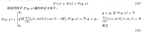 在(10)式中,Zˊ(y)是模型M1的目標(biāo)函數(shù)值上增加超過(guò)投資預(yù)算的適應(yīng)性懲罰因子P(g,y)后的總成本,g為遺傳算法進(jìn)化的代數(shù),即