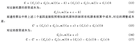 如果殘值按照購(gòu)買(mǎi)單價(jià)的30%計(jì)算,則C—Cˊ<70%Cp(t,m)<0,即通過(guò)遺傳算法得到的適應(yīng)度函數(shù)值偏高。同時(shí)可以看出,遺傳算法得到的投資成本也偏高.解決這個(gè)問(wèn)題的一個(gè)方法是,在評(píng)價(jià)一個(gè)染色體的適應(yīng)度時(shí),首先識(shí)別略集中t和m相同的元素,并同時(shí)識(shí)別是否存在機(jī)器轉(zhuǎn)移的情況,如果存在,則需要根據(jù)(13)式計(jì)算生產(chǎn)能力調(diào)整成本以修正該染色體的總成本,并同時(shí)修正適應(yīng)度函數(shù)值。