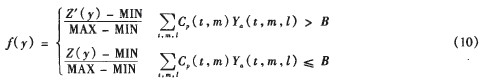 記MIN和MAX分別為某一代染色體中所有染色體對(duì)應(yīng)的模型肘.的目標(biāo)函數(shù)值的最小值和最大值,本文定義如下地適應(yīng)度函數(shù):