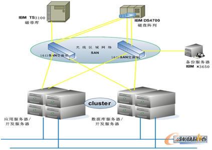 備份環(huán)境通過兩臺互為熱備的光纖交換機(jī)連接為一個整體,實現(xiàn)光纖存儲,提高了存儲的效率和性能,避免了對應(yīng)用系統(tǒng)網(wǎng)絡(luò)資源的占用和消耗。
