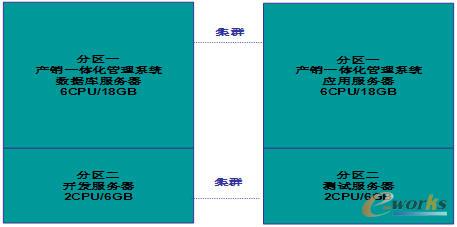 產(chǎn)銷管理系統(tǒng)主服務(wù)器采用兩臺高端UNIXT服務(wù)器——IBM P570,每臺服務(wù)器配置8路CPU,24GB內(nèi)存,同時引入分區(qū)(Partition)技術(shù),使用過程中可根據(jù)自身的業(yè)務(wù)需求,靈活多樣的規(guī)劃系統(tǒng)架構(gòu)。服務(wù)器劃分為兩個分區(qū),分別作為產(chǎn)銷一體化系統(tǒng)數(shù)據(jù)庫服務(wù)器、產(chǎn)銷一體化系統(tǒng)應(yīng)用服務(wù)器、開發(fā)服務(wù)器、測試服務(wù)器。兩個分區(qū)之間均采集群技術(shù),互為熱備份。主服務(wù)器分區(qū)示意圖如下: