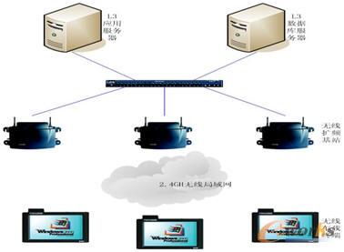 選用2.4GHz無線擴(kuò)頻基站,采用符合IEEE 802.11b標(biāo)準(zhǔn)的直序擴(kuò)頻技術(shù),在行車工作區(qū)域內(nèi)提供無線信號全面覆蓋,并為移動車載終端提供有線接入,使車載終端能直接訪問應(yīng)用服務(wù)器。