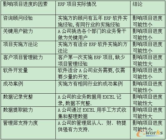 將上述分析得出的影響項(xiàng)目進(jìn)度的因素列在一個(gè)表中(見表1),結(jié)合具體的ERP項(xiàng)目分析這些因素的正面影響和負(fù)面影響.以A公司實(shí)施ERP項(xiàng)目為例,說明影響項(xiàng)目進(jìn)度的因素分析.