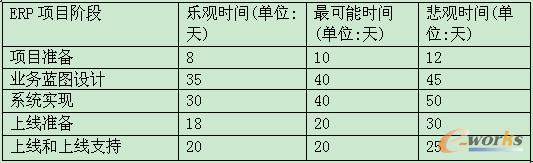 對影響項(xiàng)目進(jìn)度的因素分析的結(jié)果可以為A公司計(jì)算出合理的ERP實(shí)施五個(gè)階段的樂觀時(shí)間、最可能時(shí)間和悲觀時(shí)間.