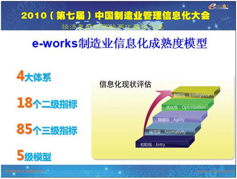 為此e-works結(jié)合了長期為企業(yè)提供第三方咨詢服務(wù)的檢驗,并借鑒了現(xiàn)有評估體系,對制造企業(yè)信息化的應(yīng)用現(xiàn)狀、存在問題和發(fā)展趨勢進行了廣泛、深入、系統(tǒng)的調(diào)查研究,在深入分析了企業(yè)信息化建設(shè)中的共性和個性化問題的基礎(chǔ)上,通過案例研究與理論研究相結(jié)合的研究方法,對制造企業(yè)信息化整體評價體系進行探索性、前沿性研究,推出了E-ITAMM模型(e-works Information Application Maturity Model,e-works企業(yè)信息化成熟度模型),e-works企業(yè)信息化成熟度模型由管理與信息化基礎(chǔ)、產(chǎn)品創(chuàng)新數(shù)字化、管理信息化、信息管理與信息安全4個級體系組成,之下共有18個二級體系,并在二級體系之下形成了84個三級指標(biāo)(其中管理與信息化基礎(chǔ)18個,管理信息化30個、產(chǎn)品創(chuàng)新數(shù)字化23個和信息管理與安全13個),每個評價點根據(jù)企業(yè)的重要度等進行了權(quán)重的劃分,同時每個評價點根據(jù)企業(yè)應(yīng)用的實際情況進行0,1,2,3,4,5分的評分,最終對企業(yè)多項指標(biāo)的分數(shù)進行加權(quán)匯總,得出企業(yè)信息化建設(shè)最終的信息化成熟度等級。