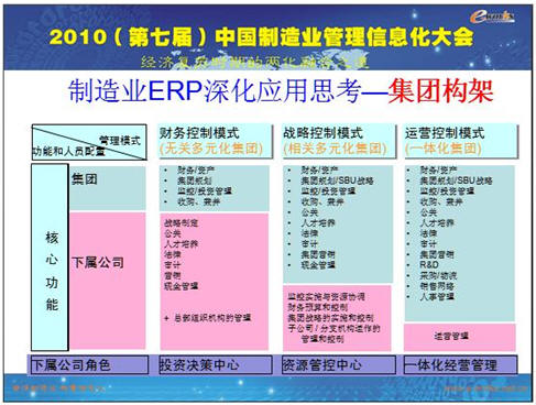 中國的企業(yè),尤其是制造企業(yè),經(jīng)過多年的發(fā)展,從單一企業(yè)向集團企業(yè)發(fā)展,由單體企業(yè)向多組織、跨區(qū)域發(fā)展,此時的IT系統(tǒng)如何規(guī)劃,如何實施?成為企業(yè)棘手的問題,因為傳統(tǒng)的單企業(yè)的實施所積累的經(jīng)驗,在集團企業(yè)來實施會產(chǎn)生更多的新問題,因為單體企業(yè)考慮更多的是流程、功能等問題,而集團企業(yè)考慮的是管控的問題(當(dāng)然管控也是靠流程來實現(xiàn)的),更加關(guān)注IT架構(gòu)。