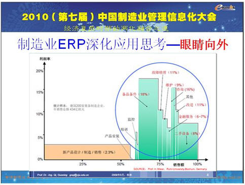 除了以上六點反思之外,我還想同大家分享的是,我們在進行深化應(yīng)用時,眼睛一定要向外,要站在整個供應(yīng)鏈的角度上來考慮為問題,畢竟狹義的ERP(企業(yè)內(nèi)部管理)所解決的是20%的問題,而80%的問題是在供應(yīng)鏈環(huán)節(jié)上,我們?nèi)绾稳ヌ嵘@是值得反思的。此外,眼睛向外的另外一個表現(xiàn),就是今天有專家提到的,我們不僅僅將企業(yè)的價值放在產(chǎn)品的實現(xiàn)(設(shè)計、制造)環(huán)節(jié)上,還需要將眼光放到后續(xù)的維修維護的管理上,也就是如何實現(xiàn)制造服務(wù)業(yè),而這些戰(zhàn)略的轉(zhuǎn)變都是需要IT系統(tǒng)進行支撐方能做到。