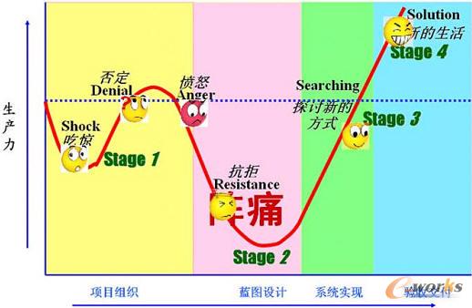 盡管在比賽前付出了心血和汗水,但是觀眾們關注的只是比賽的過程,ERP的運行同樣如此。ERP的運行有一條幸福曲線(如下圖),企業剛接觸ERP這樣的新事物時可能會有從抵觸到接受的過程,在方案的確立階段,也會存在部門間的矛盾沖突到思想一致的過程,當我們經歷了磨合后,將會有所好轉,當系統上線,企業開始逐漸主導,開始逐漸扮演重要的角色,我們就可以看到一種新的工作方式在改變,生活也會相應改變,ERP 實施的過程是一個變革的過程,也是我們幸福體驗的過程。