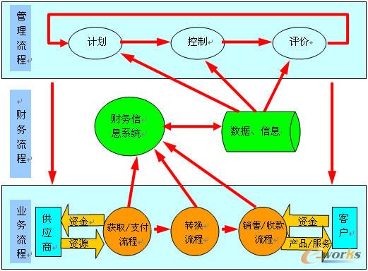 管理流程并非獨立存在,它是以財務(wù)管理系統(tǒng)產(chǎn)生的信息為依據(jù),對業(yè)務(wù)流程進行計劃、控制、評價等一系列活動,從而創(chuàng)造價值。包括三個子流程:計劃流程、控制流程和評價流程。