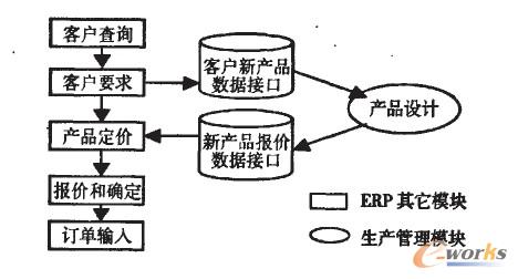 當(dāng)整個(gè)ERP系統(tǒng)的銷售模塊接到客戶要求生產(chǎn)新產(chǎn)品的通知后,系統(tǒng)通過(guò)。客戶新產(chǎn)品數(shù)據(jù)接口將客戶的要求傳送到生產(chǎn)管理模塊中的產(chǎn)品設(shè)計(jì)子模塊,再通過(guò)其中的報(bào)價(jià)系統(tǒng)進(jìn)行報(bào)價(jià),然后通過(guò)。新產(chǎn)品報(bào)價(jià)數(shù)據(jù)接口’將得出的價(jià)格送回銷售模塊,然后整個(gè)系統(tǒng)繼續(xù)進(jìn)行下面的工作。