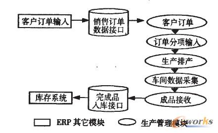 當(dāng)銷售模塊在輸入正式銷售訂單后,銷售訂單數(shù)據(jù)接口將銷售訂單傳輸?shù)缴a(chǎn)管理模塊將其轉(zhuǎn)化成生產(chǎn)訂單。當(dāng)該批訂單完成生產(chǎn)后,完成品入庫(kù)接口。再將這批產(chǎn)品從生產(chǎn)管理模塊中傳輸回庫(kù)存模塊,然后整個(gè)系統(tǒng)繼續(xù)進(jìn)行下面的工作。