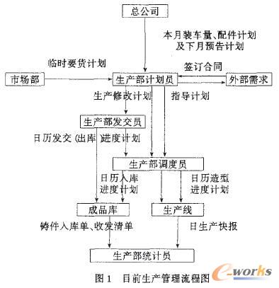 工廠目前的生產管理狀況如圖1所示。通過調研分析發現,鑄造一廠有較好的管理基礎,其管理水平在東風汽車公司中一直處于先進的行列,該廠已通IS09002和QS9000認證。但是,由于生產管理的自動化程度較低,生產管理中還存在如下的不足: