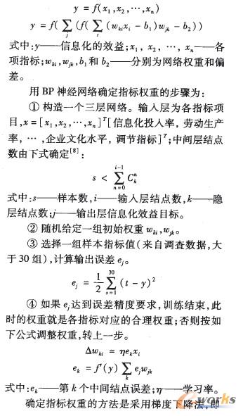 BP神經網絡是人工神經網絡的一種,由于它具有非線性和魯棒性等突出的優點,具備了比較實用和有效的訓練方法,為此,用它來確定企業信息化經濟效益評價指標權重是可行的。企業是一個復雜的系統,把信息化效益作為系統的輸出,則對應的輸入是一組指標值,即