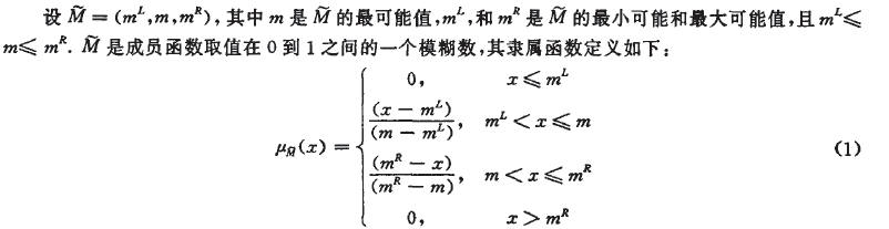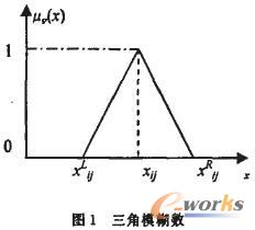 在模糊DEA模型中,可以有部分或全部輸入輸出是模糊的。對于部分模糊情形,可以將精確數轉換為模糊數來處理。設模糊數用記號“~”表示,考慮具有m個模糊輸入\和P個模糊輸出的n個DMU的評價及比較問題,為簡便起見,模糊輸入輸出均采用三角模糊數形式表示,一個典型的三角模糊數如圖1所示。