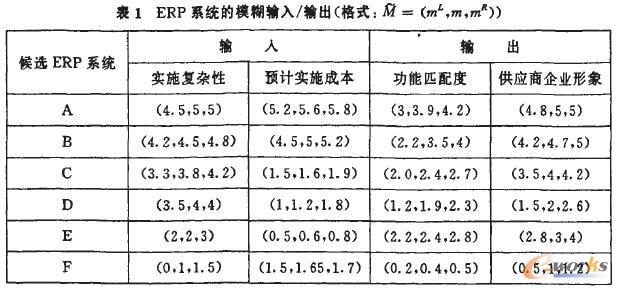 ERP系統能夠提高企業管理水平、提升企業運營效率,它對企業成功所發揮的作用已為企業界和學術界所共知。對大型ERP系統相對有效性的評價既有定量方法又有定性方法,模糊DEA屬一種定量評價方法,主要用于在ERP系統選型過程中對系統進行定量評價。Fisher Kiang等利用傳統DEA方法對ERP系統進行了評價、分析和比較,但他們的研究未充分考慮ERP系統選型過程中的不確定性和模糊性。