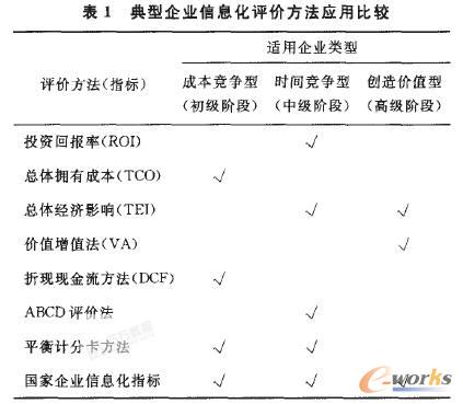對企業(yè)信息化的評價不僅要考慮宏觀的、共性的因素,還要涉及到具體企業(yè)的系統(tǒng)功能模塊、與信息化有關的業(yè)務類型、業(yè)務效益、人力資源等個性化的方面,即使是同一套指標,對不同企業(yè)評價的側(cè)重不相同,其計算的方法和數(shù)據(jù)收集整理對象也有差異。雖然美國、日本等最先進人信息化時代的國家,特別是西方一些國家對信息化的評價已經(jīng)做了大量的理論與實踐性的探索,但至今還沒有一種有效的評價方法和工具可以評價信息化建設的所有方面,并得出令人信服的結(jié)論。由企業(yè)的個性化引起的信息化建設的差異性,使針對具體企業(yè)制定的大多數(shù)統(tǒng)計或評價指標難以形成統(tǒng)一的評價工具。表1列出了典型的企業(yè)信息化評價方法或指標體系及其適用對象,其中有的方法是在另外一些方法的基礎上發(fā)展起來的,如總體經(jīng)濟影響(TotalEconomiclmpact,TEI)方法的核心是投資回報(Returnonlnvestment,ROI)分析,它的衡量指標不再以總體擁有成本(Total Costof ownership,TCO)的成本核算為中心,而在量化成本、收益和靈活性價值的基礎上,再通過風險分析對這3個方面進行修正,得出一個經(jīng)過調(diào)整的ROI。