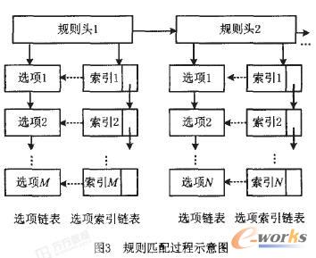 評價指標往往是按功能的不同進行分類配置,如系統(tǒng)結(jié)構(gòu)、基礎設施投資、信息人力資源、系統(tǒng)應用等。當根據(jù)評價目標配置好環(huán)境參數(shù)后,系統(tǒng)采用深度鏈式算法,對規(guī)則樹中的規(guī)則頭和規(guī)則選項進行線性檢索,從規(guī)則頭指向的選項索引開始,依次對選項索引指向的節(jié)點(指標),根據(jù)規(guī)則相關度(Cr)值進行匹配操作,直到遍歷完所有的選項索引。規(guī)則匹配過程如圖3所示。
