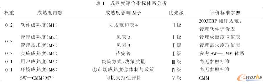 但上述研究都只是從單個側面或單個環節來思考問題,缺乏系統的分析、評價手段,對于一個由多個系統構成的大系統來說是不夠的。現在不僅缺少這樣一個體系,也缺少可操作的較完善的單個環節執行標準。對于影響各成熟度的因素沒有進行深入系統分析或重新思考;各成熟度指標體系沒有整合,合理性和可靠性未驗證;各成熟度指標未進行適應性評價,未確定數據來源和處理方式及指標取值區間;未確定合理的統計處理方法。