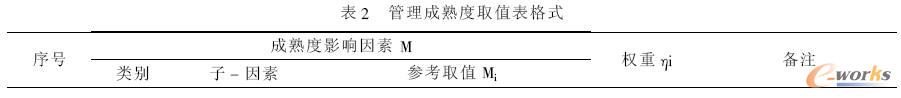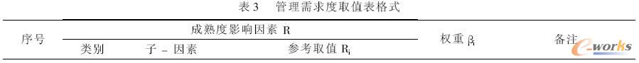 管理成熟度衡量企業是否具備實施ERP 的基本條件以及達到的程度,反映企業應用ERP的可行性,用來支持可行性研究;管理需求度能反映企業應用ERP 的需求程度和原動力。只有同時有需求也有可能的情況下,ERP 的應用才具備了基本的條件。測評指標設計就是在企業因素系統分析的基礎上,通過對因素分析法和關鍵成功因素法,對影響企業ERP 應用的基礎因素和影響信息化需求的基礎因素進行科學分析,并設計成定量指標體系,便于測評,管理成熟度、管理需求度可實現度量,其度量取值格式見表2、表3,其計算方法如下。