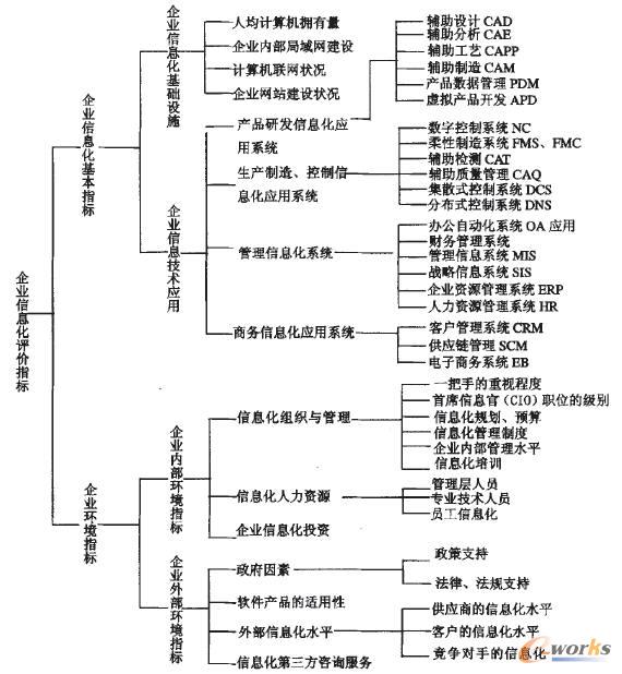 企業網絡信息化是信息化的成熟期。在這一階段企業利用網絡實現信息技術、信息資源、信息管理的整合集成。主要以人均計算機擁有量CAD/CAE/CAPP/CAM、NC/FMC/CAT、OA、財務管理系統等單項系統應用指標來評估。在這一層次中企業初步制定信息化發展戰略、規劃、制度,但是還沒有專門的信息化部門,企業員工信息化素質普遍不高。