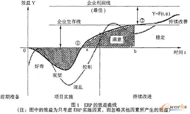 圖中實線代表ERP的效益,虛線代表ERP實施過程中人員的心態(tài)變化。①②為實施ERP所獲得的效益。ERP實施過程中由于硬件、軟件費用、咨詢、實施服務(wù)費用的增加,企業(yè)的收益實際上是減少的。當(dāng)系統(tǒng)正式開始運行后,這時,一方面系統(tǒng)用戶對系統(tǒng)的認同程度已由原來的不知所措、抵觸逐漸轉(zhuǎn)為接受甚至滿意;另一方面隨著ERP的基本功能對企業(yè)的提升作用,其效益也逐漸體現(xiàn)了出來,效益增加額表現(xiàn)為①部分。②部分的效益,需在企業(yè)進行持續(xù)的改善的前提下,即動態(tài)、循環(huán)進行戰(zhàn)略規(guī)劃、效益評估與激勵、計劃與控制、創(chuàng)新與持續(xù)改進,才能有效獲得。