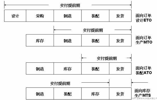 由于生產(chǎn)組織的特點,存在四種不同的制造策略:面向庫存生產(chǎn)、面向訂單裝配、面向訂單生產(chǎn)、面向訂單設計。其中面向庫存生產(chǎn)的交貨時間最短,但是也最容易產(chǎn)生庫存。