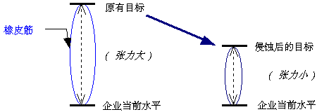 企業(yè)用戶實(shí)施ERP的主要目的是切實(shí)提升企業(yè)的管理水平,但這種提升的程度在某種程度上是難以量化描述的。因此,在使用“量身定制”的軟件時(shí),會(huì)容易忘記預(yù)期目標(biāo),在各種利益均衡和困難面前降低原有的目標(biāo),這種企業(yè)預(yù)期目標(biāo)可能受到侵蝕而在不自覺(jué)中降低的風(fēng)險(xiǎn)稱為“目標(biāo)侵蝕”風(fēng)險(xiǎn)。這種風(fēng)險(xiǎn)的模型見(jiàn)圖2,圖中,當(dāng)目標(biāo)在不自覺(jué)中受到侵蝕時(shí),橡皮筋所產(chǎn)生的拉力立即減小,反過(guò)來(lái)講,改變現(xiàn)狀的動(dòng)力也就減小,其結(jié)果是不僅總體目標(biāo)要求降低,而且改變現(xiàn)狀的動(dòng)力和力度也會(huì)跟著降低,實(shí)施ERP將得不到其預(yù)期的效果。