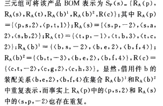 “父件一結構”表示部件具有某種裝配結構,如圖2b中“a—s”表示部件a具有裝配結構s(帶圈字母表示“結構”);“結構一子件”表示某個裝配結構中含有某個零部件,如“s—C01”。這樣就通過BOM模型中裝配結構的獨立,使“父件一結構”和“結構一子件”兩層關系分離,從而更適于表達復雜的BOM并減少冗余。如圖2b中裝配結構s的存在使得“a—s”與“s—c”相互獨立,避免了a和g相同裝配結構的重復性表示,同時a的兩種不同結構s和t得以明確地表達。為準確表達上述BOM模型,下面用數學集合的方法進行形式化描述: