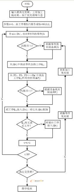 ⑥ 令t=t+1,若t小于N,則轉(zhuǎn)移到第③步;若t大于N,則計(jì)算排定的計(jì)劃是否滿足交貨期,若計(jì)劃超出交貨期,則調(diào)整零件優(yōu)先級(jí),更新加工優(yōu)先級(jí),重新進(jìn)行排序,否則結(jié)束。