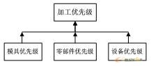 因此,除了以交貨期為優(yōu)先規(guī)則的模具優(yōu)先級(jí)外,還要給模具零件和設(shè)備設(shè)定優(yōu)先級(jí)。零件優(yōu)先級(jí)是根據(jù)實(shí)際情況和經(jīng)驗(yàn)人為設(shè)定的;設(shè)備優(yōu)先級(jí)是為了均衡設(shè)備負(fù)荷,按任務(wù)最少選擇設(shè)備。將三者結(jié)合起來(lái),一起構(gòu)成工序的加工優(yōu)先級(jí),如圖2所示。