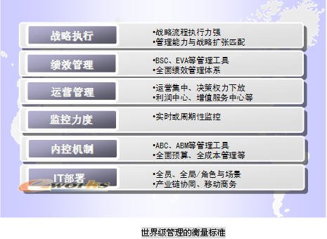 在全球化市場競爭中,能夠在細(xì)分市場或地區(qū)市場占有主導(dǎo)地位的企業(yè),其所擁有的管理模式/方法/工具和經(jīng)驗,就是世界級管理。中國企業(yè)管理在向世界級管理升級的過程中,必須了解世界級管理的衡量標(biāo)準(zhǔn),通過對比,改進(jìn)現(xiàn)有管理模型,加快中國企業(yè)向世界級管理邁進(jìn)的步伐。不僅要研究和提煉這些企業(yè)的管理思想、模式和方法,更要共同實驗,把先進(jìn)的信息技術(shù)結(jié)合到這些企業(yè)的經(jīng)營與管理的創(chuàng)新活動中。