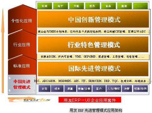 用友ERP從企業(yè)能力要素和企業(yè)競爭類型兩個緯度,針對不同類型不同能力要求的企業(yè)制定了不同的管理模式。每一種管理模式都是根據(jù)企業(yè)的競爭戰(zhàn)略和企業(yè)能力要素需求提出的,具有很強的針對性,對于企業(yè)中存在的管理問題對癥下藥,幫助企業(yè)提升管理能力和效率。用友ERP的實施過程就是幫助企業(yè)客戶有效地發(fā)掘和弘揚“價值鏈”、實現(xiàn)價值增值的過程。用友ERP的管理模式已經(jīng)向行業(yè)應(yīng)用和個性化應(yīng)用發(fā)展,并提出了全面精細(xì)的產(chǎn)品結(jié)構(gòu)。用友ERP的龐大用戶基礎(chǔ)和大量成功案例表明,用友將在中國模式連接世界級過程中發(fā)揮巨大作用。
