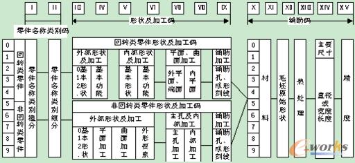 3. 編碼分類法。 圖1 JLBM-1系統(tǒng)的基本結(jié)構(gòu) 按編碼分類,首先需將待分類的諸零件進(jìn)行編碼,即將零件的有關(guān)設(shè)計(jì)、制造等方面的信息轉(zhuǎn)譯為代碼(代碼可以是數(shù)字或數(shù)字、字母兼用)。為此,需選用或制定零件分類編碼系統(tǒng)。由于零件有關(guān)信息的代碼化,就可以根據(jù)代碼對(duì)零件進(jìn)行分類。應(yīng)指出,采用零件分類編碼系統(tǒng)便零件有關(guān)生產(chǎn)信息代碼化,將有助于應(yīng)用計(jì)算機(jī)輔助成組技術(shù)的實(shí)施。 JLBM-1系統(tǒng)是我國(guó)機(jī)械工業(yè)部門為機(jī)械加工中推行成組技術(shù)而開發(fā)的一種零件分類編碼系統(tǒng)。這一系統(tǒng)經(jīng)過先后四次修訂,已于1984年正式為我國(guó)機(jī)械工業(yè)部的技術(shù)指導(dǎo)資料。JLBM-l系統(tǒng)的結(jié)構(gòu)可以說是OPITZ系統(tǒng)和KK-3系統(tǒng)的結(jié)合。