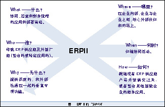 ERPII是一種應用和部署策略,它擴展了ERP的功能,使企業獲得重要的內部和外部協同、運營和財務流程的整合。對ERPII描述,包含“5W1H”內容(如圖)。