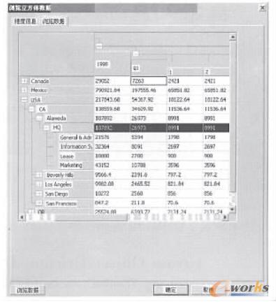 數(shù)據(jù)倉(cāng)庫(kù)是按主題組織數(shù)據(jù)的,每個(gè)主題可以看作是一個(gè)數(shù)據(jù)立方體,一般每個(gè)數(shù)據(jù)立方體都有好幾個(gè)維,每個(gè)維內(nèi)又有一些層次。復(fù)雜的數(shù)據(jù)立方體在展現(xiàn)上缺乏直觀性,尤其當(dāng)維度超出三維后,數(shù)據(jù)的表示就比較困難,因此這里采用一種二維表格的形式來(lái)表示整個(gè)數(shù)據(jù)立方體,并在此之上進(jìn)行多維分析操作。數(shù)據(jù)立方體中的維都被劃分到行維或列維兩種維度中去,在二維表的固定行和固定列中用樹型結(jié)構(gòu)體現(xiàn)維的層次結(jié)構(gòu)和層次關(guān)系,在行維和列維交織成的二維表中顯示相應(yīng)的度量數(shù)據(jù),實(shí)現(xiàn)以二維表格反映多維特征,提供數(shù)據(jù)立方體的可視化表示。