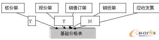 以上是各個單據(jù)之間價格的傳遞關系,那么各單據(jù)之間,價格變更對基礎價格表的影響又是如何呢?我們再以一張圖來說明。