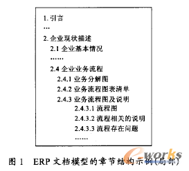 通過上述3 種機制,一個ERP 模型自上而下被分解為片段、內容對象、屬性3 個層次,并在建模工具中通過圖形或表格的形式顯示出來。ERP 模型的文檔化是將這3 種模型要素按特定的表現形式和組織方式輸出到文檔的過程。